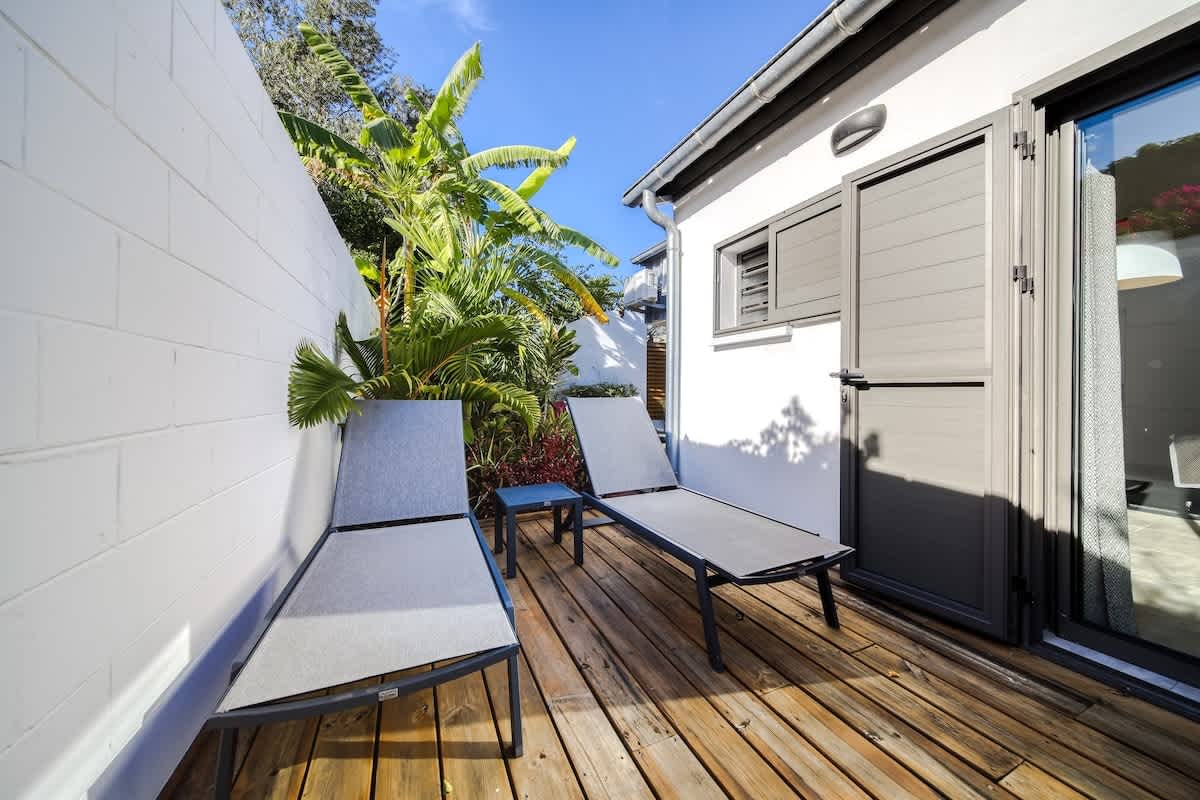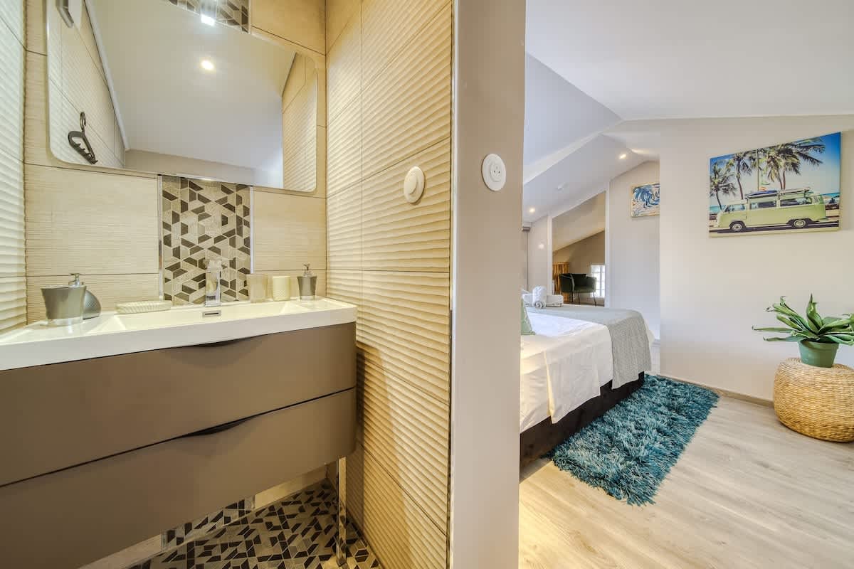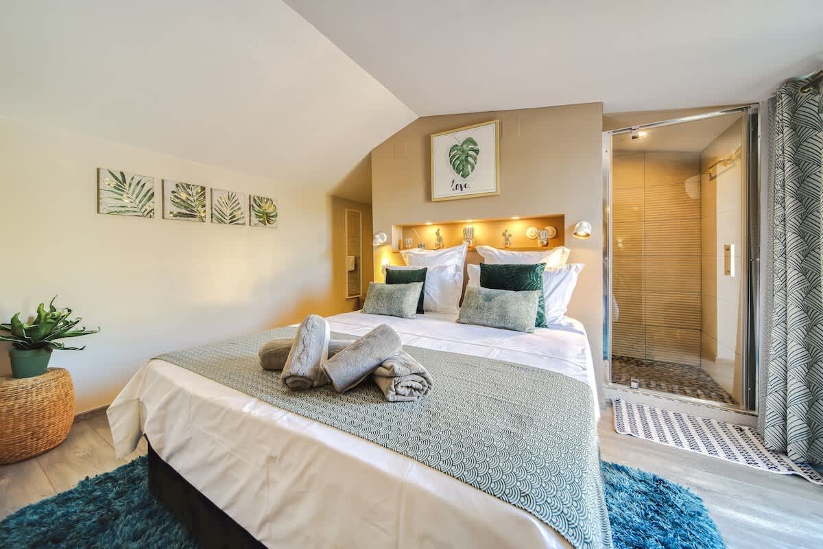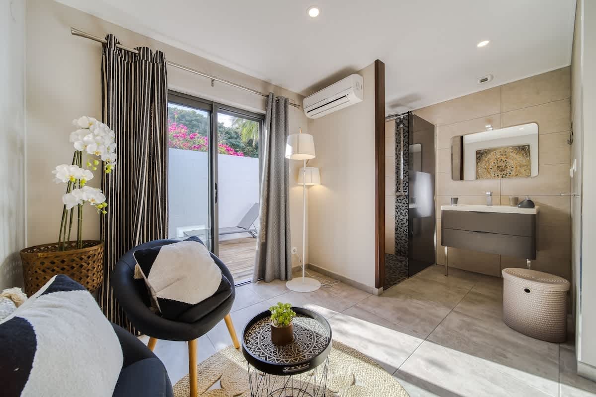 Upstairs, a bedroom, with a queen size bed, has its own walk-in shower, benefits from a storage cupboard, and opens onto a 19 m² full sun terrace.