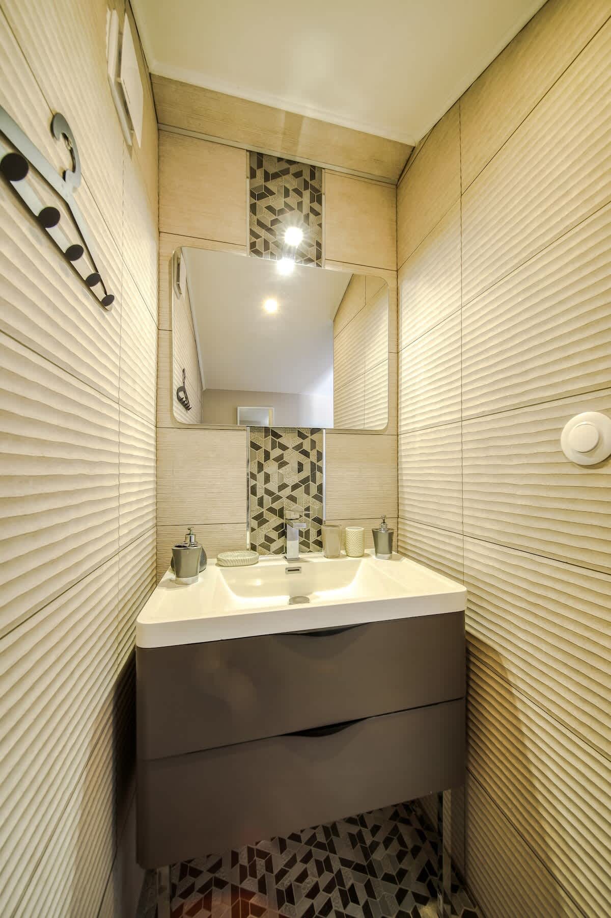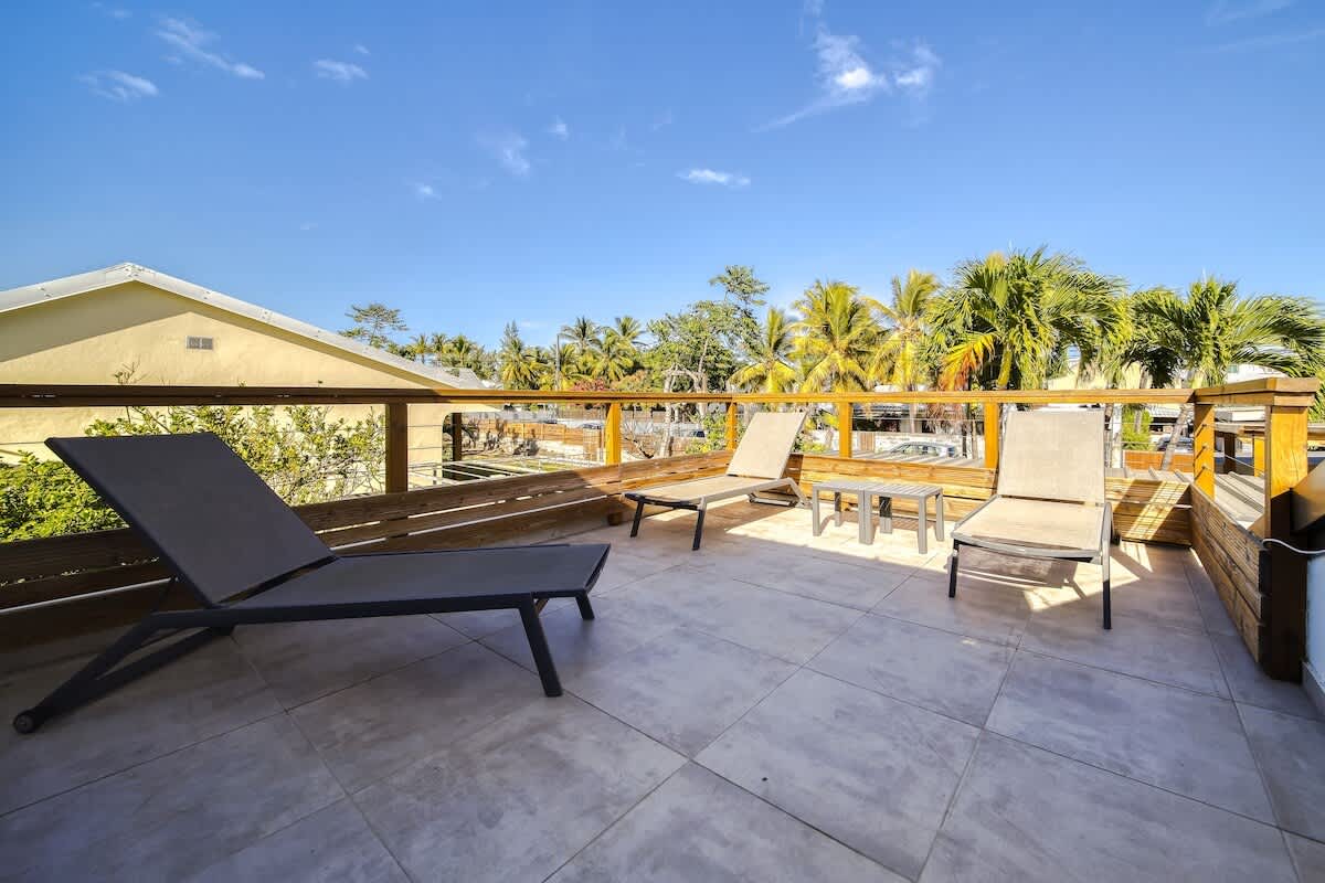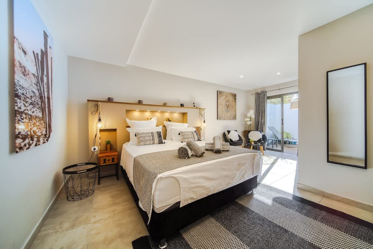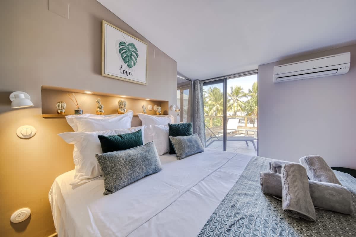 Upstairs, a bedroom, with a queen size bed, has its own walk-in shower, benefits from a storage cupboard, and opens onto a 19 m² full sun terrace.