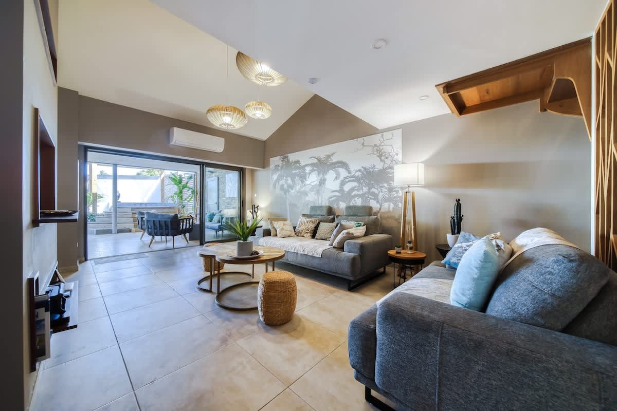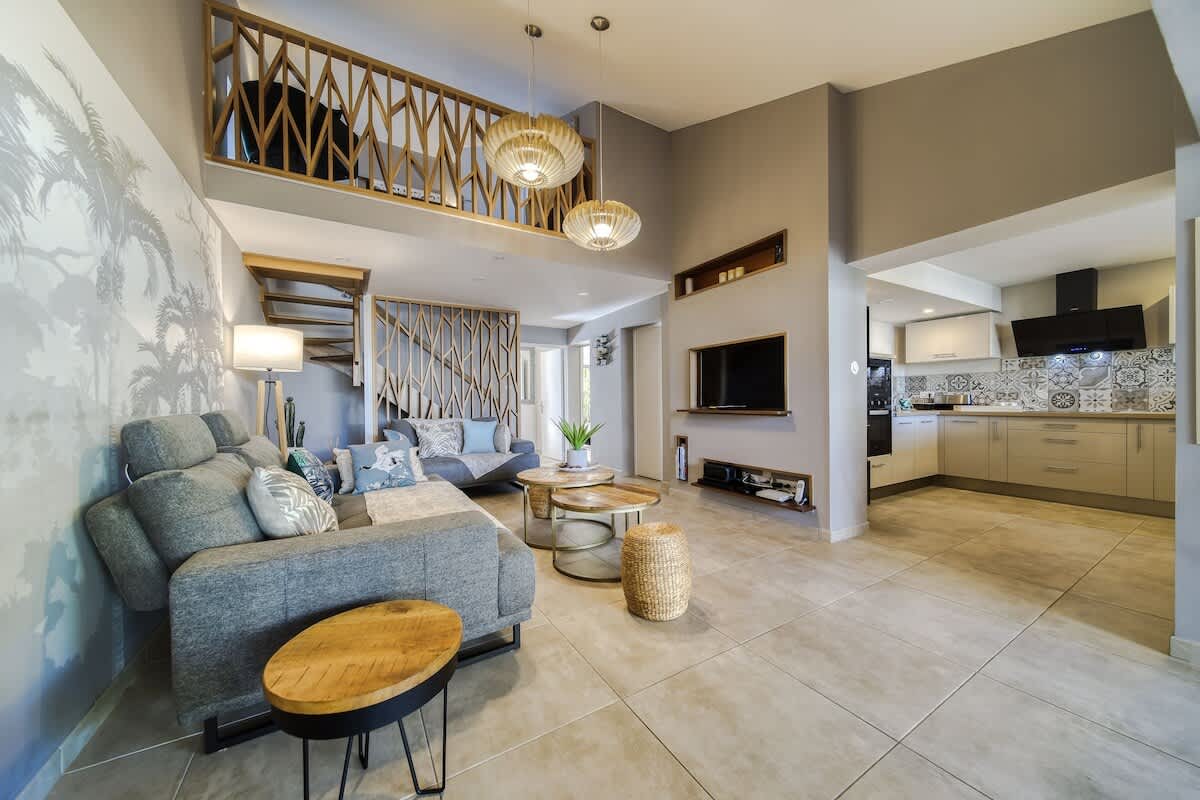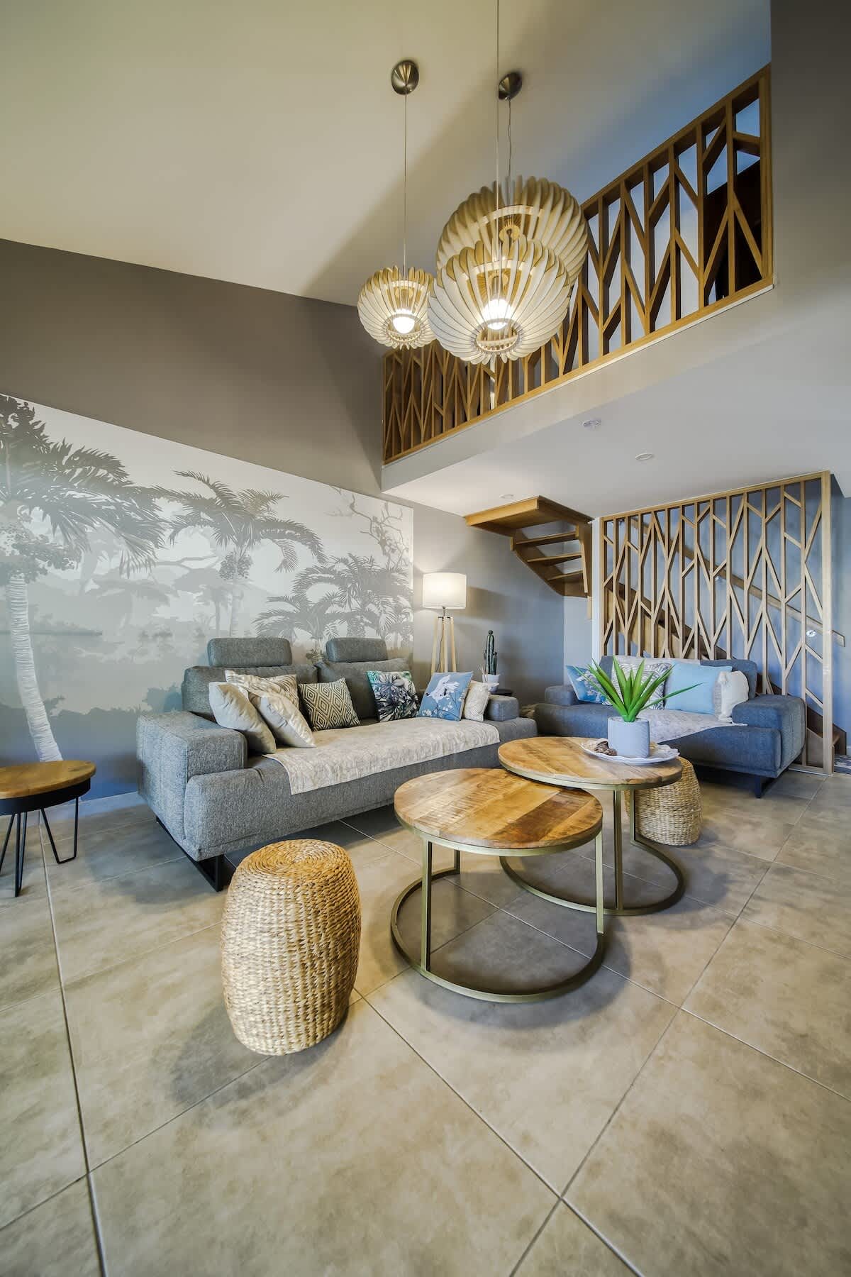 The tastefully decorated living room invites you to dream and travel in a forest of palm trees traced in its wall fresco entirely painted by hand.