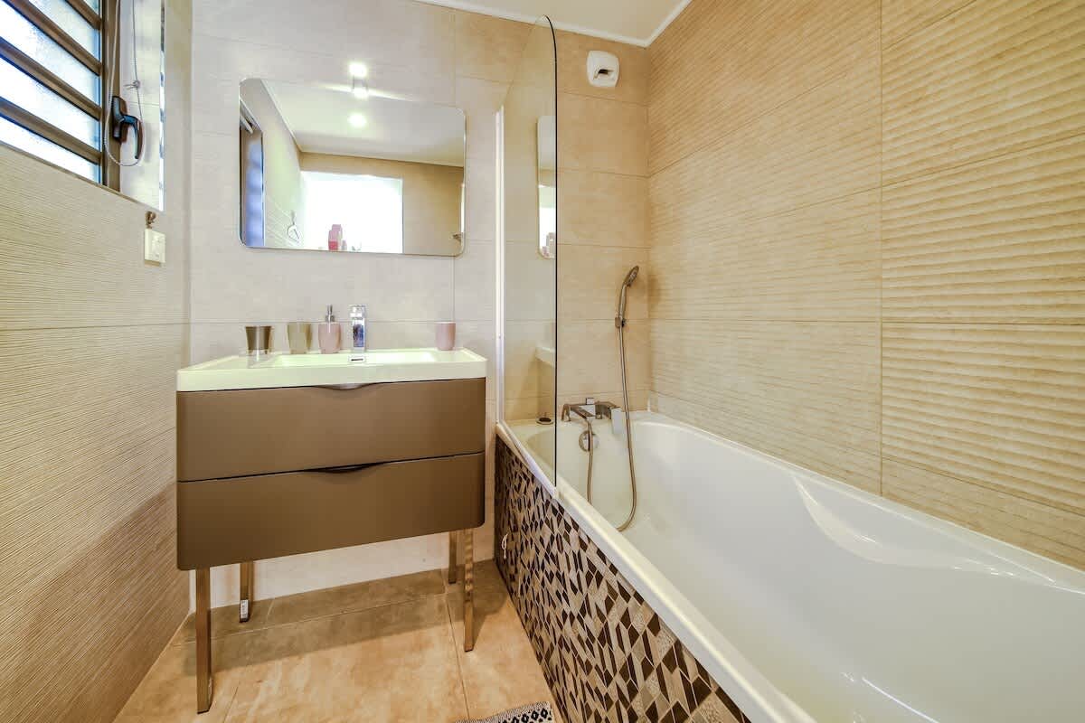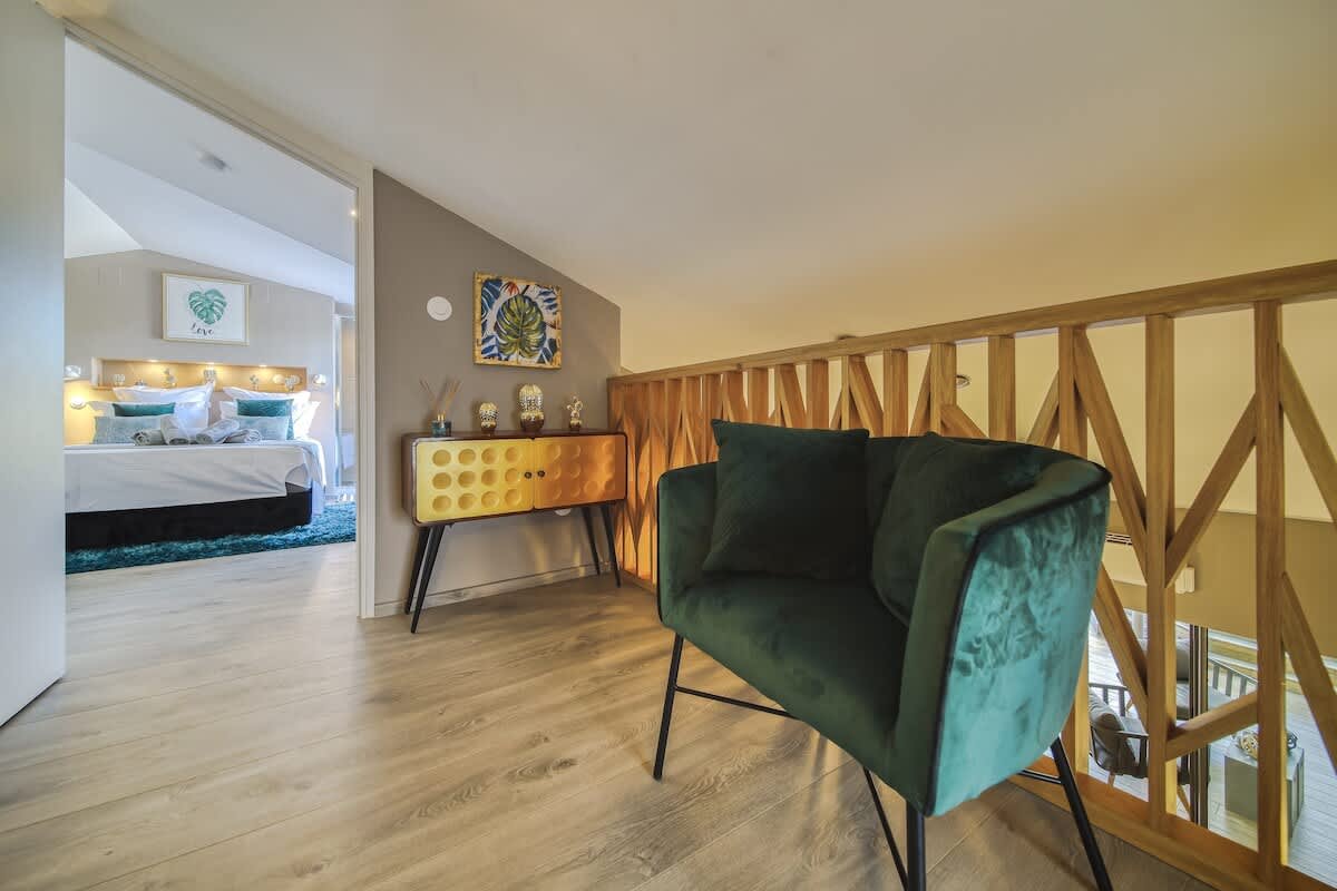 1 bedroom on the ground floor, with modular beds (2 * 90 or 1 * 180), has a bathroom with bathtub, and opens onto a relaxation area overlooking a garden