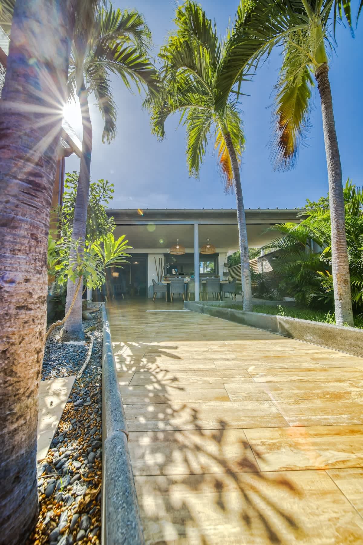 The garden, planted with trees and flowers, welcomes you under the majestic palms of Adonidia palms, also called Christmas palms, or Paul and Virginia palms.