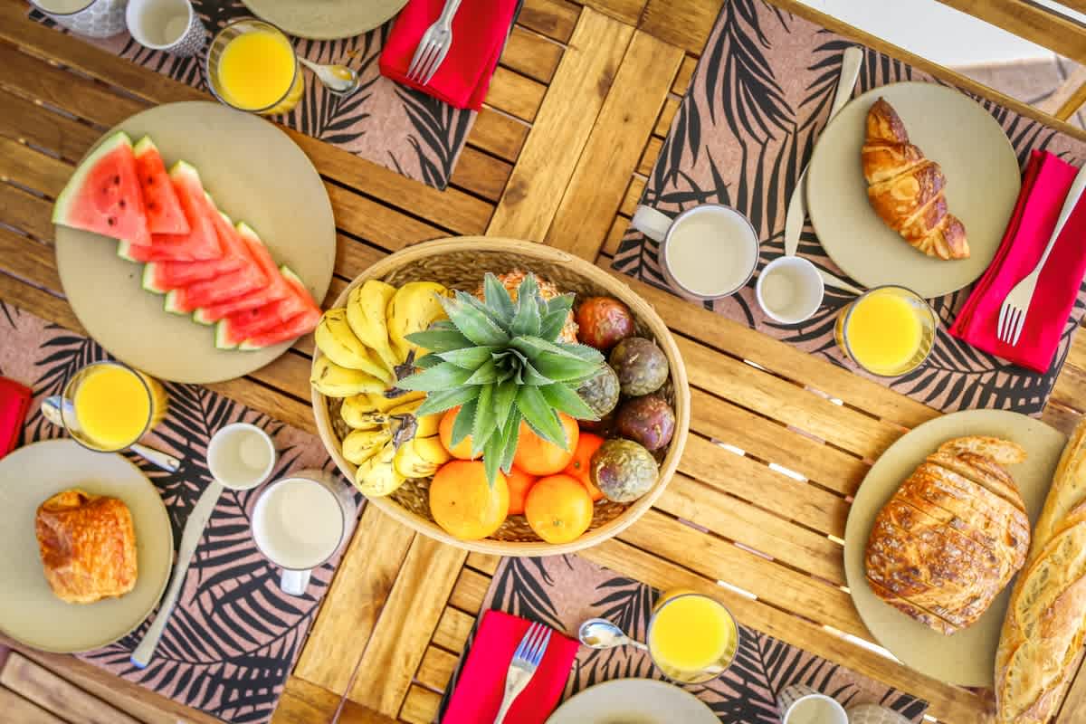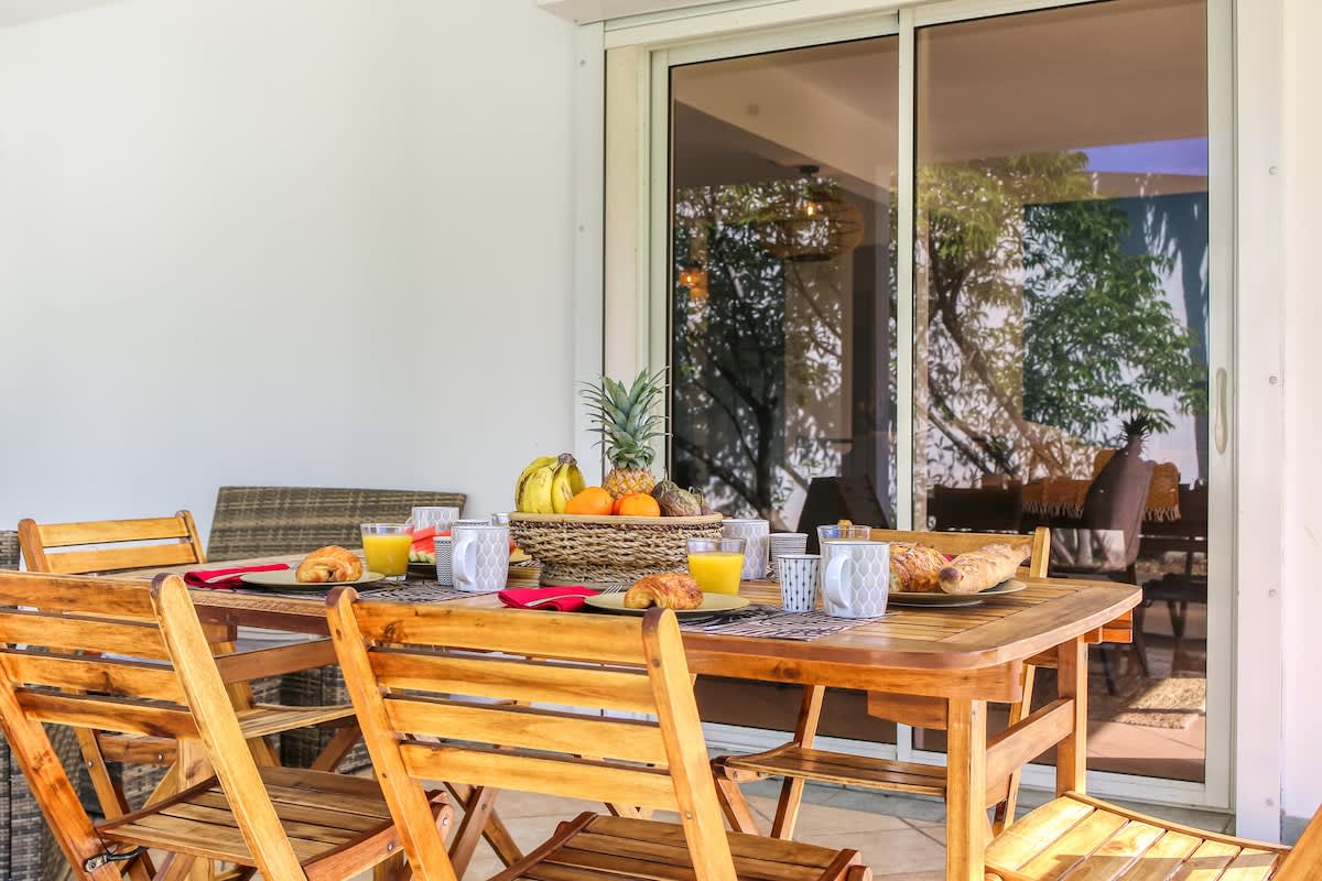 Profitez de sa grande terrasse couverte pour admirer l’arbre voyageur, pour vous relaxer en prenant un apéritif aux saveurs créoles.