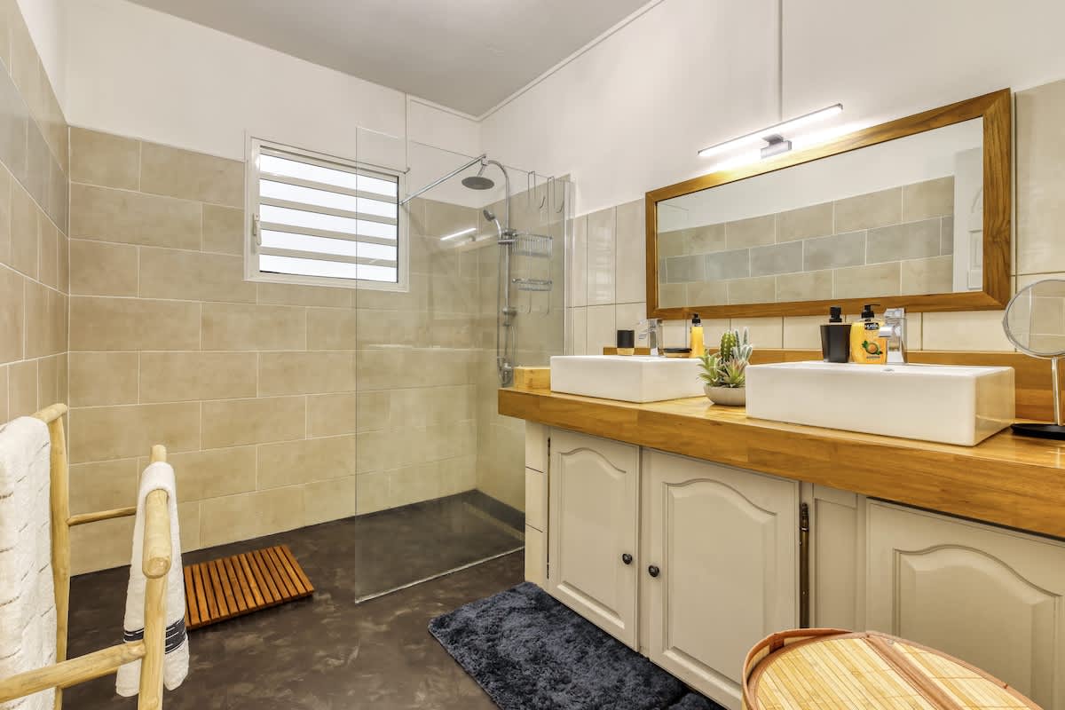 La maison dispose d’une grande salle de bain au ton naturel disposant d’une double vasque et d’une douche italienne avec un jet parapluie. Les Wc sont séparés.
