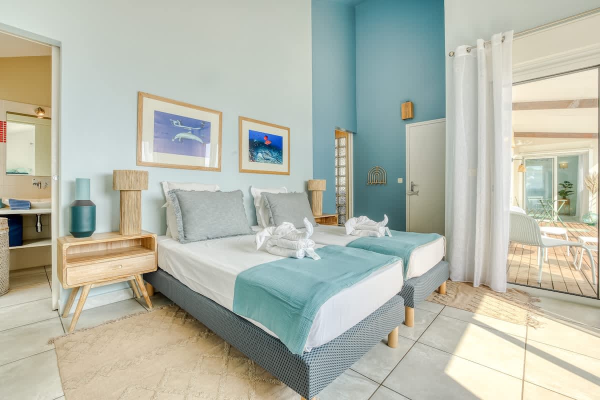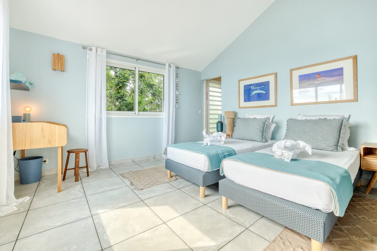 - 1 chambre double climatisée avec salle de bains attenante équipée de deux lits simples et un espace bureau