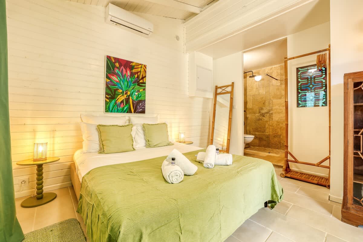 3- Le Bungalow : indépendant, situé en bord de piscine, avec kitchenette, salle de bain et lit Queen-Size. (2 couchages)