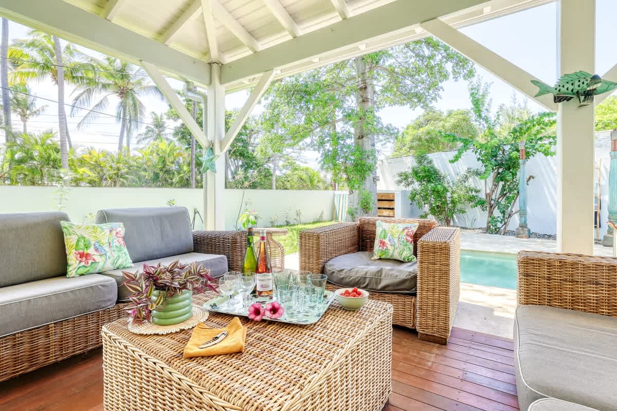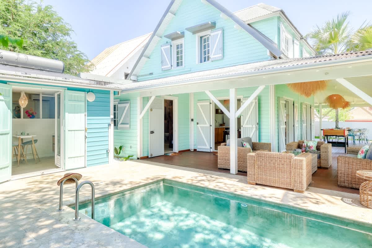 Équipements : piscine privée (4 m x 2,3 m), jardin paysagé, grande varangue, barbecue, smart TV, Wi-Fi, climatisation, lave-linge, lave-vaisselle, lit et chaise bébé.