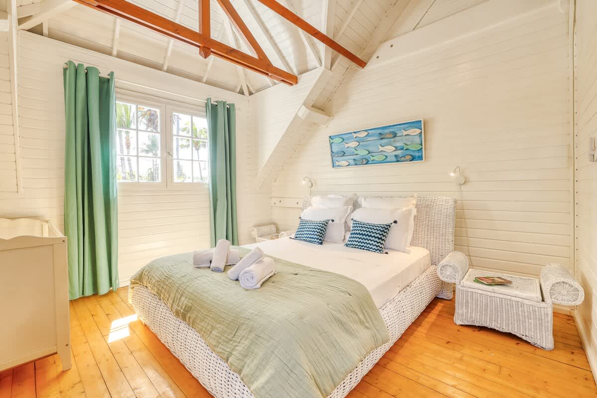 1- La Villa principale : deux chambres à l’étage, une chambre d’appoint au rez-de-chaussée, deux salles de bain. (6 couchages)