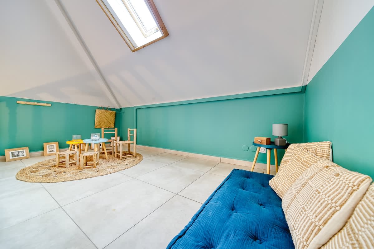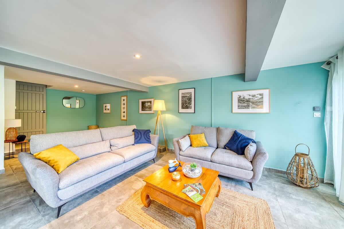Au rez-de-chaussée, découvrez une grande pièce de vie lumineuse et accueillante, soigneusement décorée autour du thème marin.