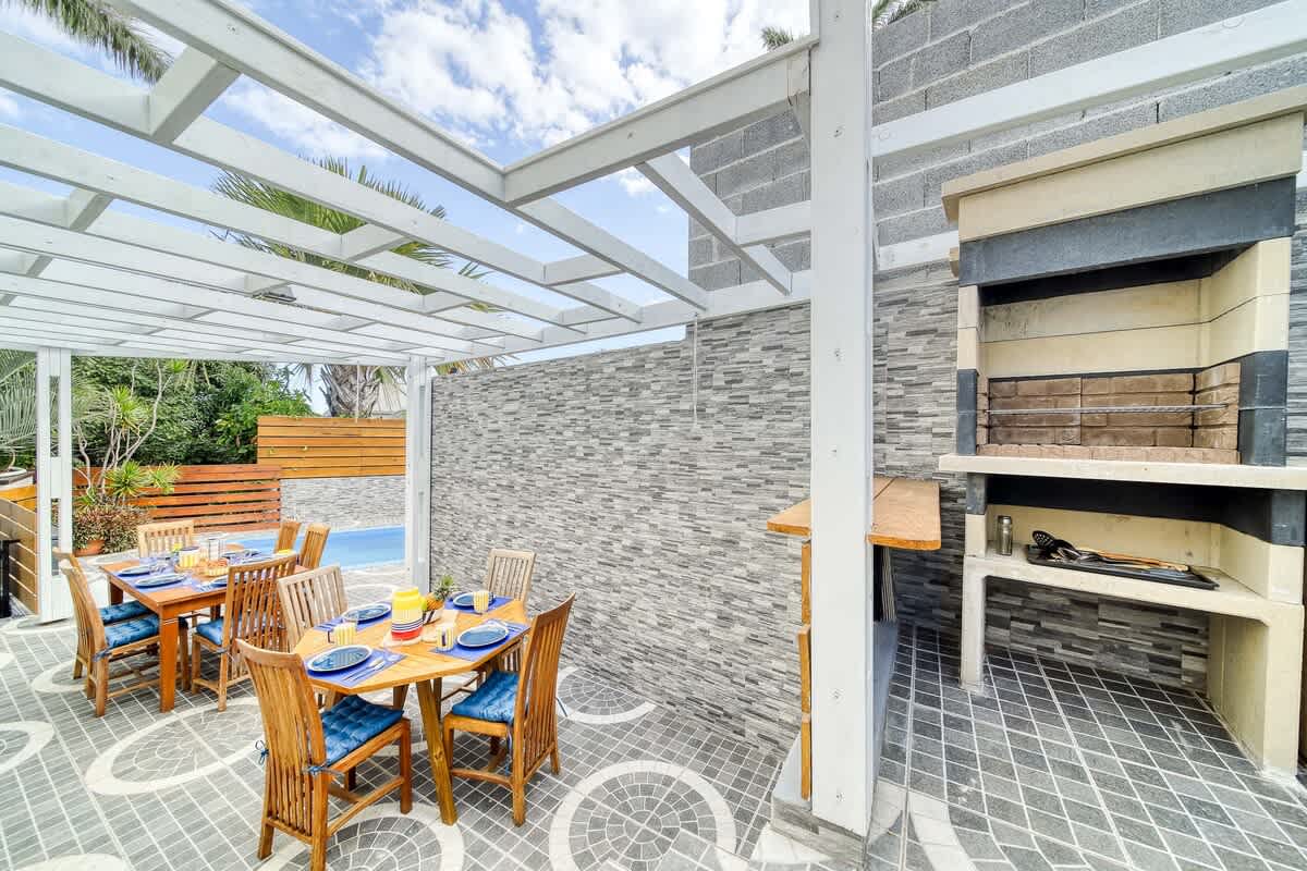 Venez profiter de sa piscine, de sa grande terrasse et de son espace barbecue, surplombés par de magnifiques palmiers.
