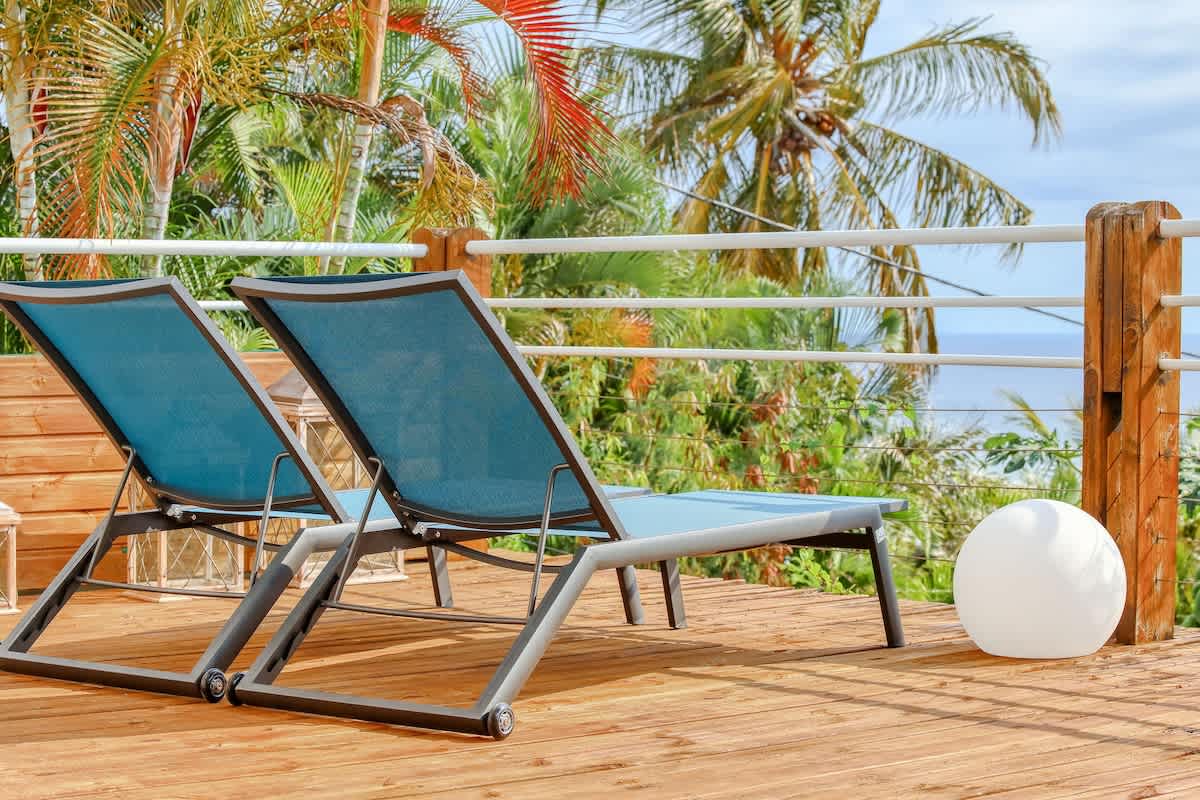- 1 belle terrasse en bois de 90 m² en bois avec transats